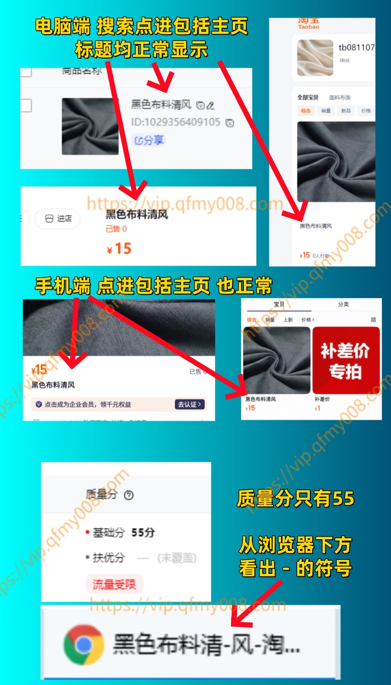 26/3-20 淘宝标题分割教程 隐性标题(无权重) 推荐 2026-03-27 10:42:57 461 ¥80 分享 此为隐性分割标题: ①所能查看的标题内容均为正常显示 ②但实际在关键词中间添加了-符号 只是不显示 简单说就是 标题添加了符号但是展示出来不显示 没有搜索权重 并且标题质量分只有55分 仅适用于 不需要搜索词 只要展示的引6商品 故而此方法只售80 有需求在买~ 同行太多,不放演示商品地址了 具体看下图 下方为详细视频教程,请付费后查看, 建议登陆后再购买,可保存购买订单 支付后未收到教程,点下方订单查询! ... 扫码免登录支付 本文章为付费文章,是否支付80元后完整阅读?如果您已购买过该文章,[登录帐号]后即可查看 支付80元 封面图